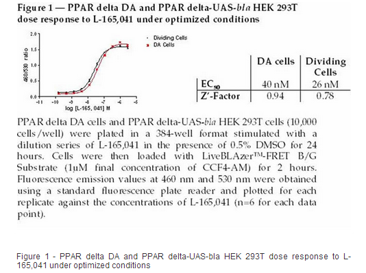 GeneBLAzer®ER alpha DA(Division Arrested) cells and ER alpha-UAS-bla GripTite™ cells contain the ligand-binding domain (LBD) of the human Estrogen receptor alpha (ER alpha) fused to the DNA-binding domain of GAL4 stably integrated in the GeneBLAzer®UAS-bla GripTite™ cell line. GeneBLAzer®UAS-bla GripTite™ cells stably express a beta-lactamase reporter gene under the transcriptional control of an upstream activator sequence (UAS). When an agonist binds to the LBD of the GAL4 (DBD)-ER alpha (LBD) fusion protein, the protein binds to the UAS, resulting in expression of beta-lactamase. Division Arrested (DA) cells are available in two configurations- an Assay Kit (which includes cells and sufficient substrate to analyze 1 x 384-well plate), and a tube of cells sufficient to analyze 10 x 384-well plates. DA cells are irreversibly division arrested using a low-dose treatment of Mitomycin-C, and have no apparent toxicity or change in cellular signal transduction. Both ER alpha DA cells and ER alpha-UAS-bla GripTite™cells are functionally validated for Z' and EC50concentrations of 17-beta Estradiol. In addition, ER alpha-UAS-bla GripTite™cells have been tested for assay performance under variable conditions, including DMSO concentration, cell number, stimulation time, and substrate loading time (data available upon request). Additional testing data using alternate stimuli are also available.