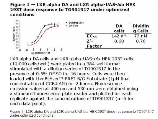 GeneBLAzer®ER alpha DA(Division Arrested) cells and ER alpha-UAS-bla GripTite™ cells contain the ligand-binding domain (LBD) of the human Estrogen receptor alpha (ER alpha) fused to the DNA-binding domain of GAL4 stably integrated in the GeneBLAzer®UAS-bla GripTite™ cell line. GeneBLAzer®UAS-bla GripTite™ cells stably express a beta-lactamase reporter gene under the transcriptional control of an upstream activator sequence (UAS). When an agonist binds to the LBD of the GAL4 (DBD)-ER alpha (LBD) fusion protein, the protein binds to the UAS, resulting in expression of beta-lactamase. Division Arrested (DA) cells are available in two configurations- an Assay Kit (which includes cells and sufficient substrate to analyze 1 x 384-well plate), and a tube of cells sufficient to analyze 10 x 384-well plates. DA cells are irreversibly division arrested using a low-dose treatment of Mitomycin-C, and have no apparent toxicity or change in cellular signal transduction. Both ER alpha DA cells and ER alpha-UAS-bla GripTite™cells are functionally validated for Z' and EC50concentrations of 17-beta Estradiol. In addition, ER alpha-UAS-bla GripTite™cells have been tested for assay performance under variable conditions, including DMSO concentration, cell number, stimulation time, and substrate loading time (data available upon request). Additional testing data using alternate stimuli are also available.