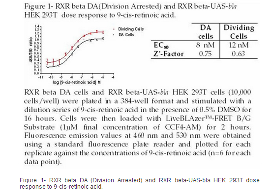 GeneBLAzer®ER alpha DA(Division Arrested) cells and ER alpha-UAS-bla GripTite™ cells contain the ligand-binding domain (LBD) of the human Estrogen receptor alpha (ER alpha) fused to the DNA-binding domain of GAL4 stably integrated in the GeneBLAzer®UAS-bla GripTite™ cell line. GeneBLAzer®UAS-bla GripTite™ cells stably express a beta-lactamase reporter gene under the transcriptional control of an upstream activator sequence (UAS). When an agonist binds to the LBD of the GAL4 (DBD)-ER alpha (LBD) fusion protein, the protein binds to the UAS, resulting in expression of beta-lactamase. Division Arrested (DA) cells are available in two configurations- an Assay Kit (which includes cells and sufficient substrate to analyze 1 x 384-well plate), and a tube of cells sufficient to analyze 10 x 384-well plates. DA cells are irreversibly division arrested using a low-dose treatment of Mitomycin-C, and have no apparent toxicity or change in cellular signal transduction. Both ER alpha DA cells and ER alpha-UAS-bla GripTite™cells are functionally validated for Z' and EC50concentrations of 17-beta Estradiol. In addition, ER alpha-UAS-bla GripTite™cells have been tested for assay performance under variable conditions, including DMSO concentration, cell number, stimulation time, and substrate loading time (data available upon request). Additional testing data using alternate stimuli are also available.