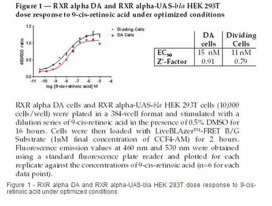 GeneBLAzer®RAR beta DA (Division Arrested) cells and RAR beta-UAS-bla HEK 293T cells contain the ligand-binding domain (LBD) of the human retinoic acid receptor beta (RAR beta) fused to the DNA-binding domain of GAL4 stably integrated in the GeneBLAzer®UAS-bla HEK 293T cell line. GeneBLAzer®UAS-bla HEK 293T cells stably express a beta-lactamase reporter gene under the transcriptional control of an upstream activator sequence (UAS). When an agonist binds to the LBD of the GAL4 (DBD)-RAR beta (LBD) fusion protein, the protein binds to the UAS, resulting in expression of beta-lactamase. DA cells are irreversibly division arrested using a low-dose treatment of Mitomycin-C, and have no apparent toxicity or change in cellular signal transduction. Both RAR beta DA cells and RAR beta-UAS-bla HEK 293T cells are functionally validated for Z' and EC50concentrations of all-trans retinoic acid (ATRA). In addition, RAR beta-UAS-bla HEK 293T cells have been tested for assay performance under variable conditions, including DMSO concentration, cell number, and stimulation time.