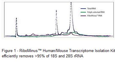 RiboMinus™ 转录组分离试剂盒 (RiboMinus™ Transcriptome Isolation Kit) 是新型纯化系统,通过去除总 RNA 样品中较大的核糖体 RNA 分子来富集全谱 RNA 转录本。 这些试剂盒采用大 rRNA 特异的 5µ 生物素标记锁核酸 (LNA) 探针,可去除人、小鼠、细菌或酵母总 RNA 中 95-98% 的 rRNA 分子(图 1)。 经过这种去除处理后,RNA 转录本的种类包括不能通过 poly(A) 选择法纯化的非 poly(A) 结尾 RNA、前加工 RNA、小 tRNA、siRNA、snRNA、microRNA、mRNA 片段和其它调节性 RNA,因而更具代表性。 RiboMinus™ 转录组分离试剂盒 (RiboMinus™ Transcriptome Isolation Kit) 可确保: • 在没有 rRNA 污染或干扰的情况下全面分析整个转录组 • 更完整地收集基因组转录物—无需依赖 poly(A) 纯化法 • 由于具有更高的信背比,芯片分析更确切、更清晰(图 2) 纯化 RNA 经过浓缩,适用于多种下游应用,包括芯片分析(图 2)、文库构建和 qRT-PCR。