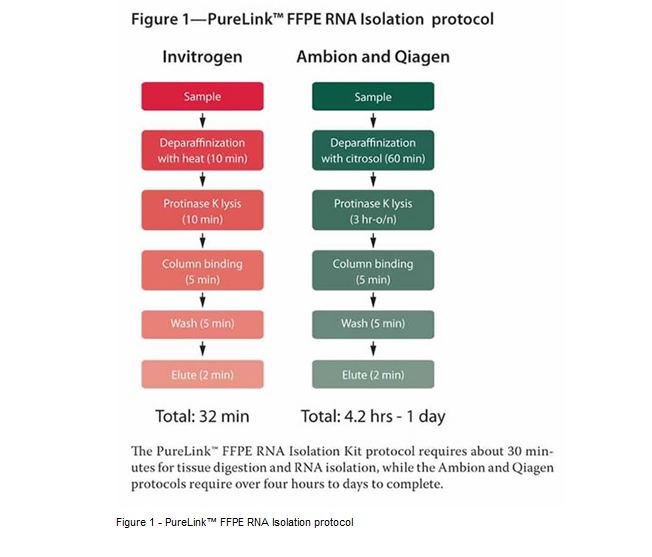 The PureLink® FFPE RNA Isolation Kit provides a simple, reliable, and rapid method to isolate high-quality total RNA from formalin-fixed, paraffin-embedded (FFPE) tissue specimens for retrospective basic and clinical biological studies of gene expression without the use of toxic organic solvents for deparaffinization.