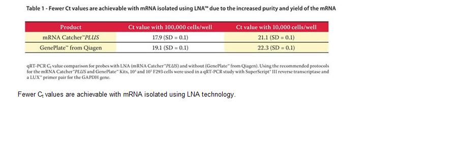 mRNA from total RNA, cells, tissue, and blood samples is hybridized to an immobilized, single-stranded 20-mer oligo(dT)-containing LNA. The incorporation of LNA into the oligo probe increases the hybridization efficiency and specificity of the mRNA binding. The mRNA can either be eluted or directly reversed-transcribed to cDNA directly in the well. The mRNA Catcher™ PLUS method does not require centrifugation, precipitation, phase separation, or column filtration. In addition, the entire method is amenable to automation for streamlined, high-throughput expression profiling for large-scale processes. Isolated mRNA is suitable for use in downstream applications such as RT-PCR and qRT-PCR.