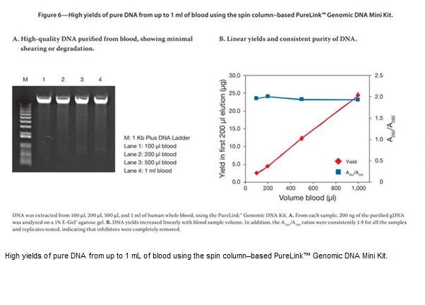 PureLink™ 基因组 DNA 小量提取试剂盒可从多种类型样品中提取大量高纯度的基因组DNA (gDNA)。 这一试剂盒采用常规硅离心柱形式,可以从血液、组织、细胞,细菌、拭子以及血斑中提取高纯度的基因组DNA。 •增加灵活性 – 一种试剂盒适用于多种类型及批量的样品 •超纯gDNA – 无论样品来源,均能获得极佳的 A260⁄A280 及A260⁄A230 吸收比 •改进型设计 – 提高产量和纯度,优化离心柱膜及缓冲液配方 一种试剂盒可用于多种样品类型 PureLink™基因组DNA小量提取试剂盒适用于多种样品类型,在使用说明中给出了针对不同样品类型的优化实验操作流程。现举例说明使用PureLink™提取基因组DNA的样品类型和样品量: