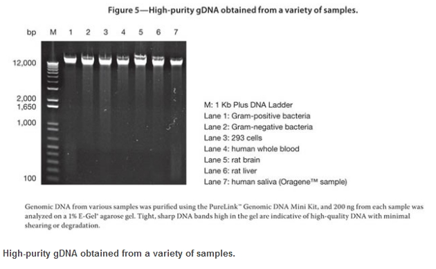 With the PureLink™ Genomic DNA Kits, youll get greater yields of higher-purity gDNA (determined by A260/A280 measurements) with all of your sample types - from bacteria to tissues to blood to cells (Figures 4-6). The PureLink™ 96 Genomic DNA Kit outperforms competitor products in both DNA yield and purity for multiple sample types, including blood (Figure 7). A260/A280 and A260/A230 ratios of PureLink™ gDNA are higher than those obtained with other kits, indicating no contamination carryover of protein or guanidine using the enhanced PureLink™ Lysis and Wash Buffers (Figure 7).