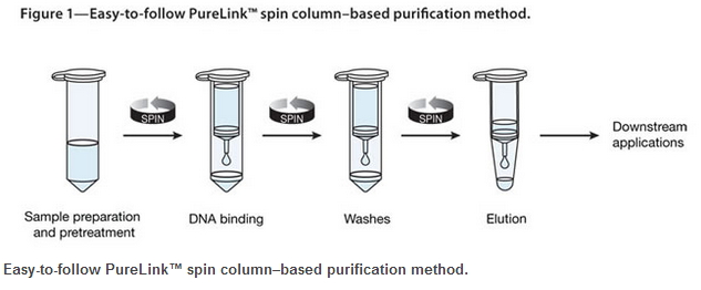 The PureLink™ Genomic DNA Mini Kit protocol improves upon the easy, familiar spin-column methods currently in use (Figures 1 and 2). Columns are newly configured to bind and release DNA more efficiently. Samples are lysed in an optimized buffer formulated to enhance proteinase K activity and eliminate protein contamination. The chaotropic salt binding buffer allows the highest DNA binding of any column method. Powerful wash buffers remove all traces of protein and salt. DNA is eluted in a low-salt buffer to allow for pH stabilization of the DNA in storage.
