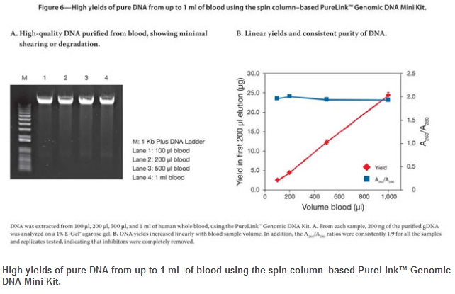 With the PureLink™ Genomic DNA Kits, youll get greater yields of higher-purity gDNA (determined by A260/A280 measurements) with all of your sample types - from bacteria to tissues to blood to cells (Figures 4-6). The PureLink™ 96 Genomic DNA Kit outperforms competitor products in both DNA yield and purity for multiple sample types, including blood (Figure 7). A260/A280 and A260/A230 ratios of PureLink™ gDNA are higher than those obtained with other kits, indicating no contamination carryover of protein or guanidine using the enhanced PureLink™ Lysis and Wash Buffers (Figure 7).
