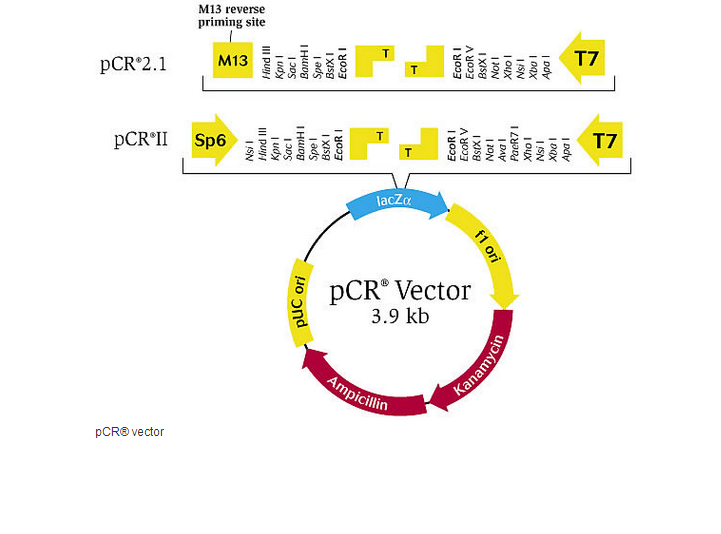 The TA Cloning® Kit with pCR™2.1 vector provides a quick, one-step cloning strategy for directly inserting a Taq-amplified PCR product into a plasmid vector. The TA Cloning® Kit uses the pCR™2.1 cloning vector and ExpressLink™ T4 DNA Ligase to generate a ligation product in a fifteen-minute, room-temperature ligation step. Reactions typically yield >80% recombinants containing inserts.