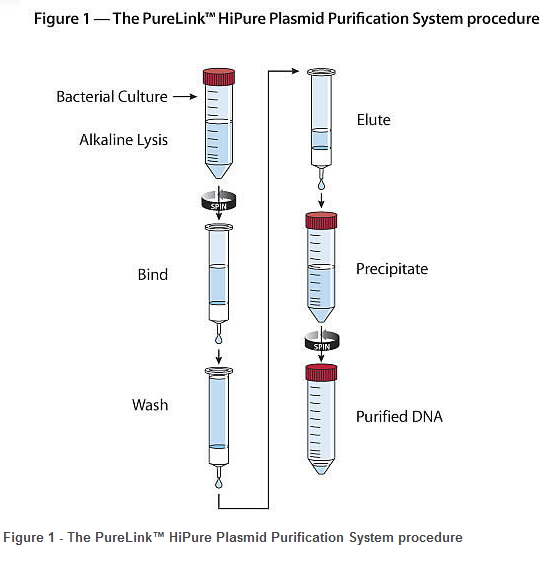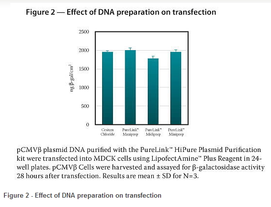 PureLink™ HiPure 质粒纯化系统 (PureLink™ HiPure Plasmid Purification System) 设计用于以各种规模分离最高纯度的 (1) 质粒 DNA(表 1)。 简单的实验方案 - 阴离子交换树脂纯化的质粒 DNA(图 1)的质量相当于进行了两次氯化铯梯度离心,后者是最严格的 DNA 纯化方法。 不到两个小时,DNA 的纯度就足以用于转染,无需通过额外步骤去除污染物,如 RNA、蛋白质和内毒素(图 2)。 另外,去除了酚、氯仿、溴化乙锭和氯化铯,因而最大程度避免了有害物质的接触和处理。