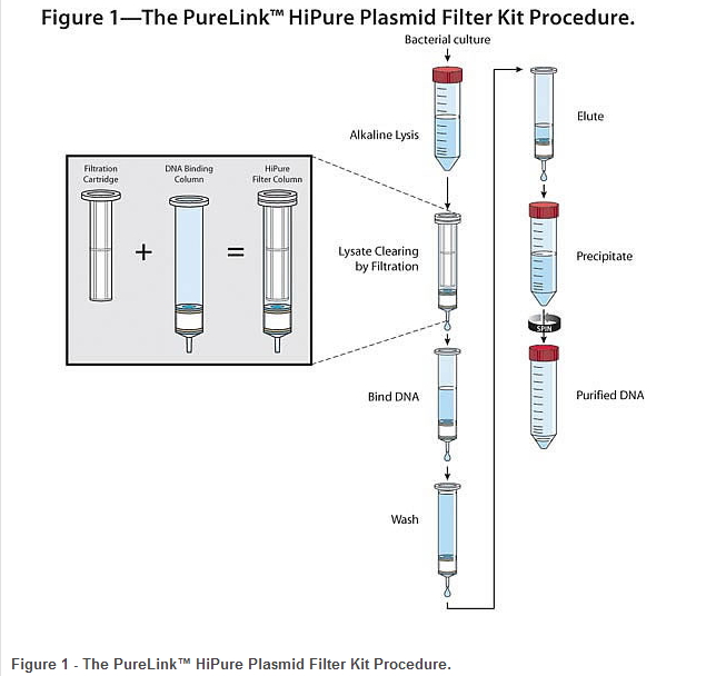 PureLink™ HiPure 质粒提取试剂盒 (PureLink™ HiPure Plasmid Kit) 新增了 HiPure 过滤柱,无需离心即可快速澄清细菌裂解液(图 1)。 裂解液过滤筒整合到了 DNA 结合柱,在同一个步骤中,既能澄清裂解液,又可使质粒 DNA 直接结合到阴离子交换树脂上。 单次柱洗涤即可去除杂质,例如:RNA、蛋白质、代谢物和其它低分子量分子,超纯质粒 DNA 用高盐缓冲液洗脱。 然后进行异丙醇沉淀步骤,脱盐和浓缩 DNA,再通过离心的方法回收 DNA。 整个方案可在约两小时内完成。
