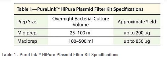 PureLink™ HiPure 过滤法质粒提取试剂盒 (PureLink™ HiPure Filter Plasmid Kit) 设计用于从 25 至 500 ml 菌液中分离最高纯度的质粒 DNA(表 1)。 PureLink™ HiPure 过滤法质粒提取试剂盒 (PureLink™ HiPure Plasmid Filter Kit) 包括 HiPure 过滤柱,将细菌裂解液澄清过滤与质粒 DNA 阴离子交换树脂纯化整合到一个单元。 所得质粒 DNA 的质量相当于进行了两次氯化铯梯度离心,后者是最严格的 DNA 纯化方法。 不到两小时即可纯化出适于转染和其它应用的高质量 DNA,无需通过额外步骤去除污染物,如 RNA、蛋白或内毒素。 另外,方案中去除了酚、氯仿、溴化乙锭和氯化铯,因而最大程度减少了有害物质的接触和处理。