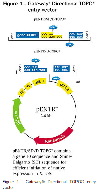 The pENTR™/D-TOPO® Cloning Kits utilize a highly efficient, 5-minute cloning strategy ("TOPO® Cloning") to directionally clone a blunt-end PCR product into a vector for entry into the Gateway® System or the MultiSite Gateway® System. Blunt-end PCR products clone directionally at greater than 90% efficiency, with no ligase, post-PCR procedures, or restriction enzymes required.