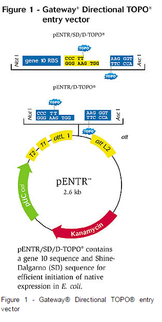 The pENTR™/SD/D-TOPO® Cloning Kits utilize a highly efficient, 5-minute cloning strategy ("TOPO® Cloning") to directionally clone a blunt-end PCR product into a vector for entry into the Gateway® System or the MultiSite Gateway® System. Blunt-end PCR products clone directionally into the pENTR™/SD/D-TOPO® entry vector at greater than 90% efficiency, and include an upstream Shine-Dalgarno sequence for expression in prokaryotes.