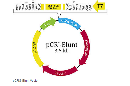 Each Zero Blunt® PCR Cloning Kit contains linearized pCR®-Blunt vector, control plasmid, sterile water, 10X Ligase Buffer, T4 DNA Ligase, M13 forward and reverse primers, and dNTPs. Competent Cell Kits contain One Shot® Chemically Competent E. coli , S.O.C. medium, and a supercoiled control plasmid. Store the One Shot® E. coli at -80°C. Store all other components at -20°C. All reagents are guaranteed stable for 6 months when properly stored.