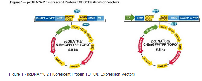 The Vivid Colors™ pcDNA™6.2 Fluorescent Protein TOPO® Expression Vectors (Figure 1) allow you to rapidly clone your gene and fuse it to the widely used and well characterized Fluorescent Proteins (FPs) from the jellyfish Aequorea victoria (1, 2). These powerful TOPO® cloning vectors contain the Emerald Green Fluorescent Protein (EmGFP) or the Yellow Fluorescent Protein (YFP) for simple, non-invasive detection of recombinant protein (Figure 2). Both FPs have been humanized for optimal mammalian expression (3). The Vivid Colors™ pcDNA™6.2 Fluorescent Protein TOPO® Expression Vectors offer: