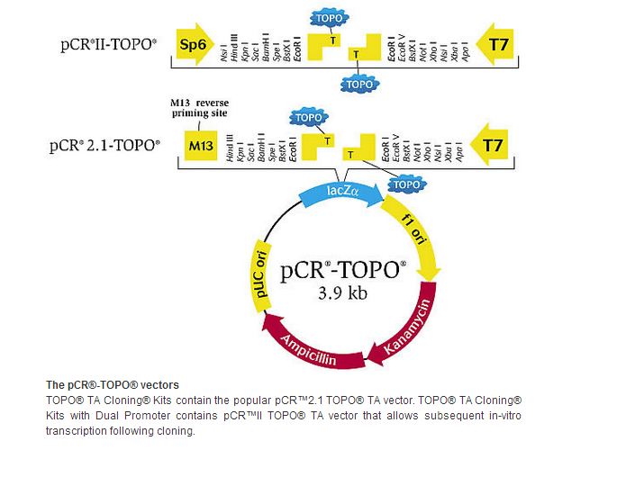 pCR™ 2.1-TOPO® TA vector—cloning and subcloning simplicity The pCR™ 2.1-TOPO® TA vector is linearized with 3'-thymidine (T) overhangs for direct ligation of Taq polymerase–amplified PCR products (TA cloning®) and is "activated" with covalently bound Topoisomerase I. There is no need to add ligase and cloning is complete in 5 minutes. EcoRI sites flanking the PCR product insertion site allow for easy excision of inserts or use any combination of 15 convenient restriction sites flanking your PCR insert for easy, directional subcloning.