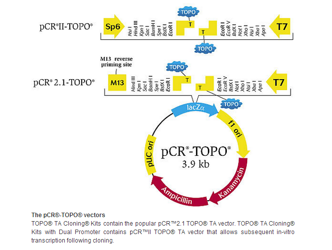 • Choice of T7 (pCR™2.1-TOPO®) or T7 and SP6 (pCR™II-TOPO®) promoters for in vitro RNA transcription and sequencing. Each vector also contains M13 forward and reverse primer sites for sequencing.
