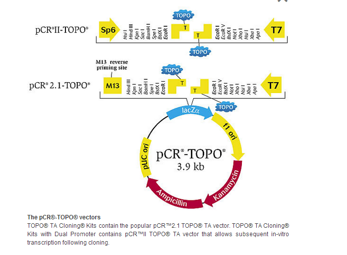 • Choice of T7 (pCR™2.1-TOPO®) or T7 and SP6 (pCR™II-TOPO®) promoters for in vitro RNA transcription and sequencing. Each vector also contains M13 forward and reverse primer sites for sequencing.