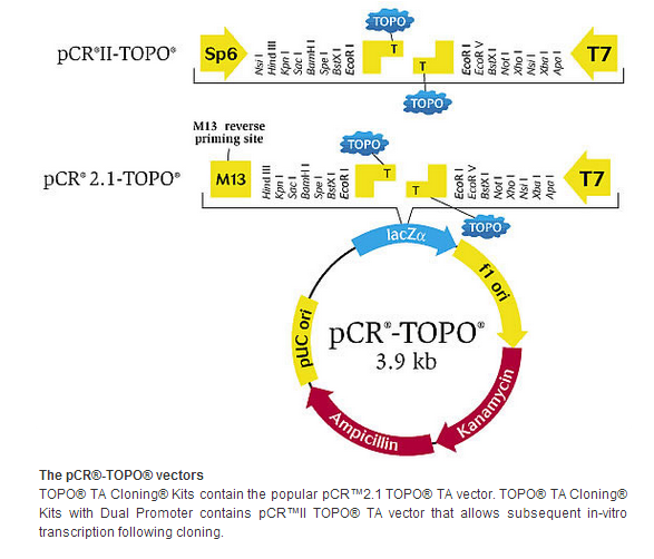 • 3´-T overhangs for direct ligation of Taq-amplified PCR products • Choice of T7 (pCR™2.1-TOPO®) or T7 and SP6 (pCR™II-TOPO®) promoters for in vitro RNA transcription and sequencing. Each vector also contains M13 forward and reverse primer sites for sequencing. • EcoR I sites flanking the PCR product insertion site for easy excision of inserts • Kanamycin and ampicillin resistance genes for your choice of selection in E. coli • Easy blue/white colony screening for selection of recombinants
