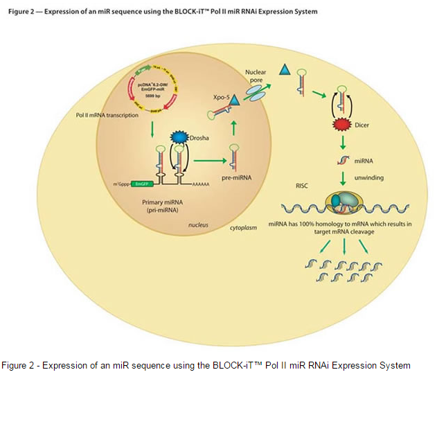 BLOCK-iT™ Pol II miR RNAi 表达载体试剂盒 (BLOCK-iT™ Pol II miR RNAi Expression Vector Kit) 将传统 RNAi 载体的优点(表达稳定并能够使用病毒导入)以及组织特异性表达和同一转录本多靶点抑制的功能集于一身。 BLOCK-iT™ Pol II miR RNAi 表达载体试剂盒 (BLOCK-iT™ Pol II miR RNAi Expression Vector Kit) 含有的 pcDNA™6.2-GW/miR 载体设计用于表达人工 miRNA,这些经过工程设计的 miRNA 与靶序列有 100% 的同源性,可以引起靶标的切割。 该载体包括内源性 miRNA 的侧翼序列和环序列,内源性 miRNA 可指导从较长的 Pol II 转录本 (pre-miRNA) 上切除工程化的 miRNA。 使用 Invitrogen 一流的 BLOCK-iT™ RNAi Designer,超过 70% 的重组体能产生超过 70% 的抑制效率。 工程化 miRNA 的 Pol II 表达可实现: o 在 CMV 即刻早期启动子作用下高效表达,可通过 MultiSite Gateway® 重组技术选用组织特异性启动子和其它受调控的启动子 o 与用于基因表达的多种 Invitrogen Gateway® 目的 (DEST) 载体兼容;包括用于稳定转导分裂细胞、非分裂细胞和原代细胞类型的慢病毒载体,用于染色体单位点整合的 Flp-In™ 系统,以及替代报告基因融合构建体 o 同一转录本可表达的工程化 miRNA 多于一种,因此可同时抑制多个基因并产生合成表型 工作原理 为了实现 miR RNAi 序列的高水平表达,pcDNA™6.2-GW/miR 载体含有 CMV 启动子(图 1)。 只需在免费的在线 BLOCK-iT™ RNAi Designer 中输入 RefSeq 注册号或核苷酸序列,该软件就会设计与目的基因具有 100% 同源性的优化 miRNA。 采用快速连接实验方案克隆 miRNA 并进行转染,可立即表达 miRNA。 所表达的 miRNA 在核内经内源细胞机制(包括 Drosha 酶)加工后,转运至细胞质,由 Dicer 酶进一步加工(图 2)。 然后,完成加工的 miRNA 结合到 RISC,在此处其功能类似于 siRNA,使 mRNA 靶标被切割。 miRNA 表达盒、miR 侧翼区及与目的基因同源的 miRNA 可轻松转移到多种 DEST 载体中,因此能以多种方式进行表达。 具体机制是:通过 Gateway® 重组反应将 miRNA 表达盒转移到 pDONR™ 载体(BP 反应),再转移到所选的 DEST 载体(LR 反应)。