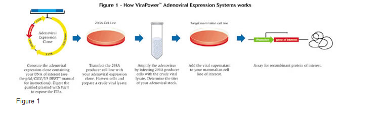 The ViraPower™ Adenoviral Promoterless Gateway® Expression Kit combines Invitrogen’s ViraPower™ Adenoviral and Gateway® technologies to facilitate easy recombination-based cloning and adenoviral-based, transient expression of a target gene in dividing and non-dividing mammalian cells. The pAd⁄PL-DEST™ vector allows generation of an adenovirus containing the target gene where expression is driven by a promoter of choice. Alternatively, the vector may also be used to express small RNA molecules from their appropriate promoters.