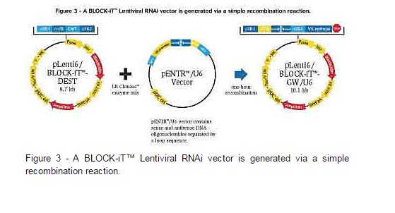 The BLOCK-iT™ RNAi U6 Entry Vector Kit allows streamlined cloning of shRNA target sequences for testing in transient experiments. Selected RNAi expression cassettes are quickly and efficiently recombined from the BLOCK-iT™ RNAi U6 entry vector into the pLenti6/BLOCK-iT™-DEST vector via a standard Gateway® LR recombination reaction (Figure 3).