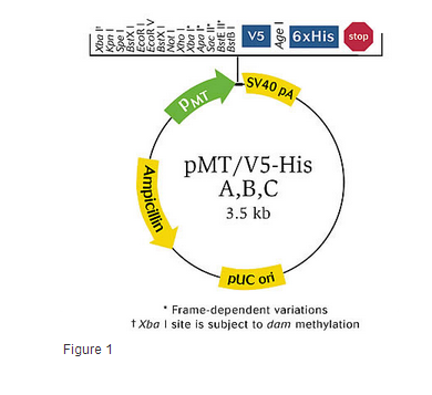 The DES®-Inducible Kit provides the expression vector pMT/V5-His and a choice of Blasticidin (pCoBlast) or hygromycin (pCoHygro) selection. This vector uses the Drosophila metallothionein gene promoter that is induced in S2 cells upon addition of copper sulfate or cadmium chloride to the culture medium. The pMT/V5-His vector offers the following features: