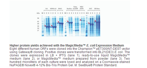 In addition, MagicMedia™ E. coli Expression Medium is ideal for simultaneous expression of multiple clones for high-throughput applications.