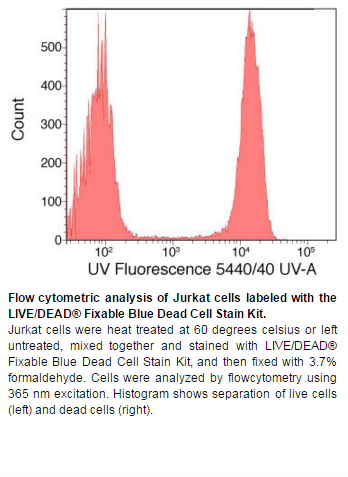 The LIVE/DEAD™ Fixable Blue Dead Cell Stain Kit is used to determine the viability of cells prior to the fixation and permeabilization required for intracellular antibody staining or prior to elimination of biohazardous materials using formaldehyde fixation. This kit has been optimized and validated for use with a UV laser flow cytometer.