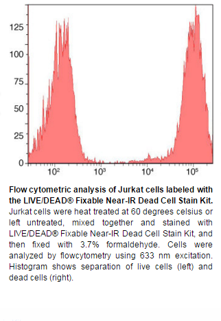 The LIVE/DEAD™ Fixable Far-Red Dead Cell Stain Kit is used to determine the viability of cells prior to the fixation and permeabilization required for intracellular antibody staining or prior to elimination of biohazardous materials using formaldehyde fixation. This kit has been optimized and validated for use with a red laser flow cytometer.