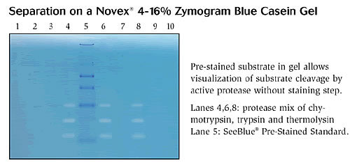 Novex® Zymogram Gels are excellent tools for detecting and characterizing proteases that utilize casein or gelatin as a substrate. Proteases are run on a gel containing one of these substrates under denaturing conditions and visualized as clear bands against a dark background following a simple renaturing, developing, and staining protocol. Zymogram gels are commonly used to detect matrix metalloproteinases.