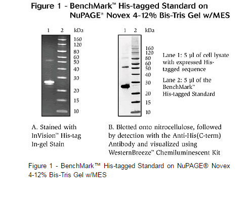 The BenchMark™ His-tagged Protein Standard can be used as a positive control and for molecular weight sizing in his-tagged fusion protein detection. It can be used with NuPAGE® Gels and Tris-Glycine Gels. The BenchMark™ His-tagged Standard offers: