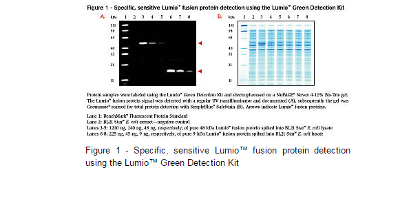 The Lumio™ Green Detection Kit is a sensitive and highly specific kit for labeling Lumio™ fusion proteins prior to electrophoresis. The Lumio™ Green Kit enables immediate visualization of Lumio™ fusion protein bands directly in a polyacrylamide gel. Using the Lumio™ Green Detection Kit you'll: