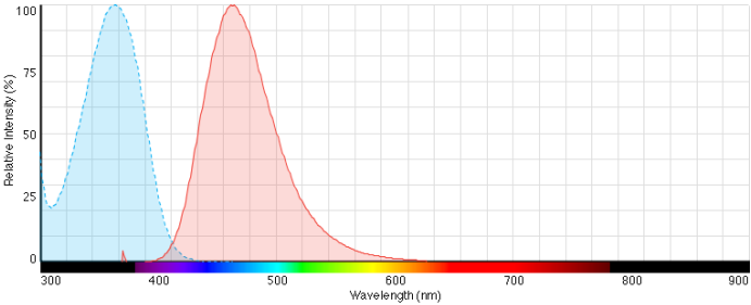 The amine-reactive Marina Blue® succinimidyl ester can be used to create blue-fluorescent bioconjugates. Based on the 6,8-difluoro-7-hydroxycoumarin fluorophore, Marina Blue® dye exhibits bright blue fluorescence emission near 460 nm and is optimally excited by the intense 365 nm spectra line of the mercury-arc lamp. Because the pKa values of Marina Blue® derivatives are 2-3 log units lower than those of the corresponding 7-hydroxycoumarin conjugates, Marina Blue® conjugates are strongly fluorescent even at neutral pH.