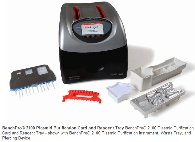 BenchPro® 2100质粒纯化卡和试剂托盘试剂盒(货号 MC2001)与BenchPro® 2100质粒纯化仪(货号 MC1001)搭配使用,用以从细菌细胞中大规模纯化质粒DNA。纯化卡设计成单一使用方式,内置一系列捕获和纯化膜用于直接从培养物中通过阴离子交换法纯化质粒。试剂托盘是预装好的,且所有必要缓冲液用锡箔密封。还提供了一次性的细胞衬垫和盖子用于向仪器中添加细菌培养物。不需要额外的试剂或塑料制品用于质粒纯化。