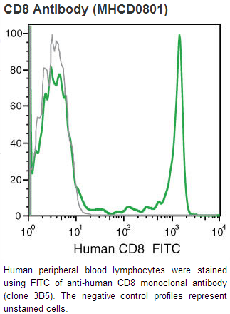 CD8 molecule is composed of two chains termed alpha and beta. CD8 is found on a T cell subset of normal cytotoxic / suppressor cells which make up approximately 20 to 35 % of human peripheral blood lymphocytes. The CD8 antigen is also detected on natural killer cells, 80% of thymocytes, on a subpopulation of 30% of peripheral blood null cells and 15 to 30% of bone marrow cells. CD38 (T10) is a single chain 46 kDa type II integral glycoprotein with a short N terminal cytoplasmic tail. CD38 is highly expressed on thymocytes. It is also expressed by early cells of B and T lineages, NK cells, plasma cells, monocytes and macrophages and may be detected on cells from multiple myeloma, ALL (B and T) and some AML. In normal lymph nodes and tonsils the antigen is detected mainly on B cells in germinal centers and in plasma cells. The extracellular domain of the molecule shares a high homology sequence with Aplysia ADP ribosyl cyclase. CD38 functions as a multicatalytic ectoenzyme serving as ADP ribosyl cyclase, ADPR hydrolase and possibly NAD+ glycohydrolase, or as a surface receptor.