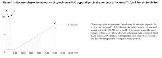 Optimized for LC/MS analysis, Invitrosol" LC/MS Protein Solubilizer greatly improves data quality by removing detergents that are incompatible with MS ionization techniques (e.g.CHAPs, Triton-X, SDS, etc.). Invitrosol™ LC/MS Protein Solubilizer is compatible with enzymatic proteolysis and improves statistical confidence in mass spectral results for hydrophobic proteins and peptides. Additionally, Invitrosol™ LC/MS Protein Solubilizer does not interfere with your chromatography separations (Figure 1) and does not contaminate LC/MS instrumentation.