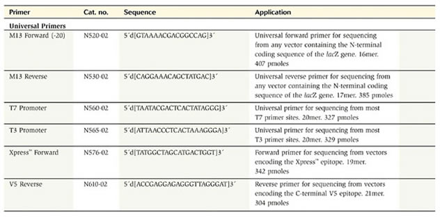 Oligonucleotides complementary to a DNA template are necessary to prime DNA synthesis for sequencing reactions. Invitrogen offers a wide selection of single-strand primers that may be used in either single- or double-stranded sequencing protocols. All sequencing primers are non-phosphorylated and are supplied lyophilized.