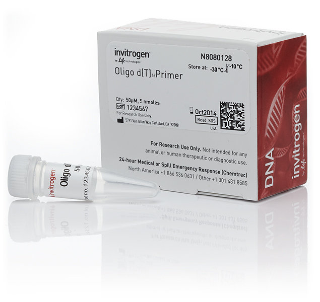 Invitrogen® Oligo d(T)16 is a homo-oligomeric deoxyribonucleotide (poly dT) that is non-phosphorylated and chemically synthesized. It is used for priming and reverse transcription of polyadenylated (poly A+) mRNA. Five nmoles of primer is supplied at a concentration of 50 µM.