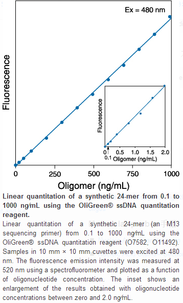 Our Quant-iT™ OliGreen® ssDNA reagent is an ultrasensitive, green-fluorescent nucleic acid stain for quantitating oligonucleotides and single-stranded DNA (ssDNA) in solution. This reagent is also available in a kit complete with buffer and oligonucleotide standard ([PRODUCT O11492]).