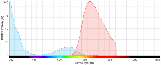 PI binds to DNA by intercalating between the bases with little or no sequence preference. In aqueous solution, the dye has excitation/emission maxima of 493/636 nm. Once the dye is bound, its fluorescence is enhanced 20- to 30-fold, the fluorescence excitation maximum is shifted ~30–40 nm to the red and the fluorescence emission maximum is shifted ~15 nm to the blue, resulting in an excitation maximum at 535 nm and fluorescence emission maximum at 617 nm.