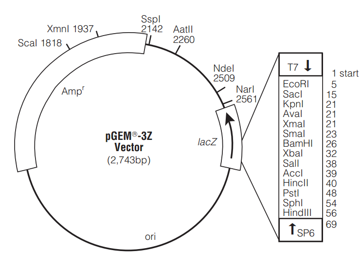 pGEM® -3Z Vector 可作为标准克隆载体使用,同时也可在体外高效地合成RNA。载体上带有来自于pUC18 的lacZ a- 肽和多克隆位点区域,可以通过蓝/ 白筛选重组子。此外,紧接着多克隆位点,载体还含有SP6 和T7 RNA 聚合酶启动子。 pGEM® -3Z 和pGEM® -4Z 载体本质上是相同的,只是SP6 和T7 启动子的方向不同。