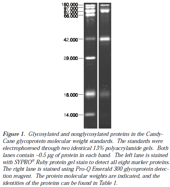 Molecular Probes 专有的 Pro-Q Emerald 300 和 Pro-Q Emerald 488 糖蛋白染色试剂盒 (Pro-Q Emerald 488 Glycoprotein Stain Kit) 使用最先进的技术检测凝胶中和印迹膜上的糖蛋白。 凝胶染色速度快,而且非常灵敏。 在 3 个小时内,每个条带有可能检测到低至 300 pg 的糖蛋白,这取决于糖基化程度。因而这些染料的灵敏度是标准品红染色的 50 倍。