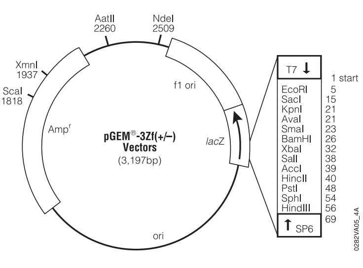 pGEM® -3Zf(+) 和pGEM® -3Zf(-) Vector 由pGEM® -3Z 载体衍生而来,含有丝状噬菌体f1 的复制起点。载体上的β- 半乳糖苷酶的α- 肽编码区中有多克隆位点,多克隆位点旁边还含有SP6 和T7 RNA 聚合酶启动子。选用合适的E. coli 菌株( 比如JM109),就能通过蓝/ 白筛选的方法把α- 肽插入失活的重组克隆直接鉴别出来。多克隆位点区域含有一些单一的限制性位点,如EcoRI, SacI,KpnI, AvaI, SmaI, BamHI, XbaI, SalI, AccI, HincII, PstI, SphI 以及HindIII。pGEM® -3Zf(+) 和pGEM® -3Zf(-) 载体除了f1 起点的方向外,其它都是一样的。因此可以作为标准克隆载体、体外转录的模板,也可用于制备环化ssDNA。