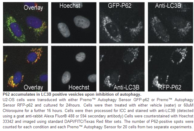 Each Premo™ Autophagy Sensor GFP-p62 Kit includes BacMam 2.0 GFP-p62 reagent and chloroquine diphosphate, which is used to inhibit autophagy.