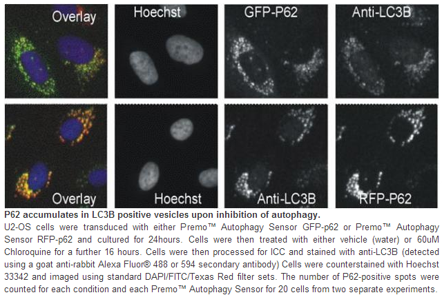 Each Premo™ Autophagy Sensor RFP-p62 Kit includes BacMam 2.0 RFP-p62 reagent and chloroquine diphosphate, which is used to inhibit autophagy.
