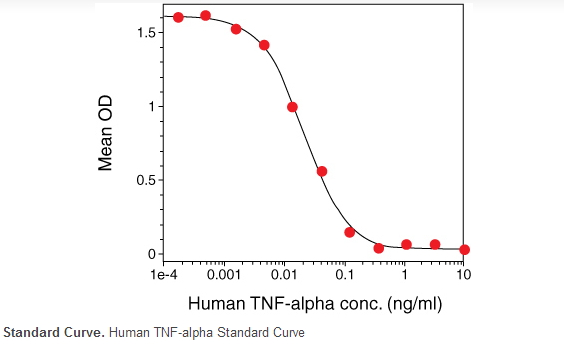 In-house activity testing of Gibco® Recombinant Proteins includes cell proliferation, cytotoxicity, chemotaxis, calcium flux, secondary cytokine up-regulation, induction of surface antigen expression, antiviral, and protease assays. Recombinant Human Tumor Necrosis Factor-α (TNF) specific activity is determined by the dose dependent cytotoxic effect on L929 cells in the presence of actinomycin D.
