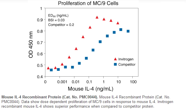 High Biological Activity In-house activity testing of Gibco® Recombinant Proteins includes cell proliferation, cytotoxicity, chemotaxis, calcium flux, secondary cytokine up-regulation, induction of surface antigen expression, antiviral, and protease assays. Recombinant Mouse Interleukin 4 (IL4) specific activity is determined by measuring the dose-dependent proliferation of murine HT-2 cells.