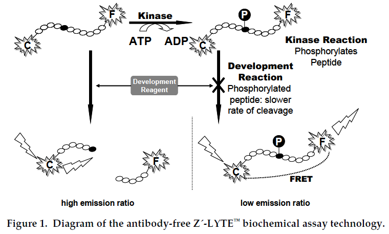 A coumarin and fluorescein-labeled peptide substrate which can be used for kinase screening in an antibody-free format. This peptide is based upon LAT, containing Tyr-200.