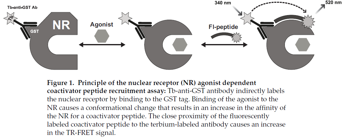 The LanthaScreen® TR-FRET LXR (liver X receptor) beta Coactivator Assay provides a sensitive and robust method for high-throughput screening of potential LXR beta ligands as agonists of coactivator recruitment. The kit uses a terbium (Tb)-labeled anti-GST antibody, a fluorescein-labeled coactivator peptide, and an LXR beta ligand-binding domain (LBD) that is tagged with glutathione-S-transferase (GST), in a homogeneous mix-and-read assay format.